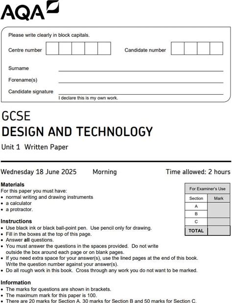 2025 Aqa Gcse Design And Technology Unit 1 And Mark Scheme 8552/W